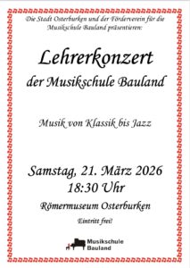 Die Stadt Osterburken lädt alle Musikinteressierten am Samstag, den 21. März 2026, um 18:30 Uhr herzlich zum traditionellen Lehrerkonzert der Musikschule Bauland in den Marc-Aurel-Saal im Römermuseum Osterburken ein! Die Lehrkräfte der Musikschule Bauland sind neben ihrer pädagogischen Tätigkeit auch künstlerisch aktiv und werden auch beim diesjährigen Konzert in unterschiedlichen musikalischen Stilrichtungen und in verschiedenen Besetzungen ihr Können und ihr breites musikalisches Spektrum eindrucksvoll unter Beweis stellen!