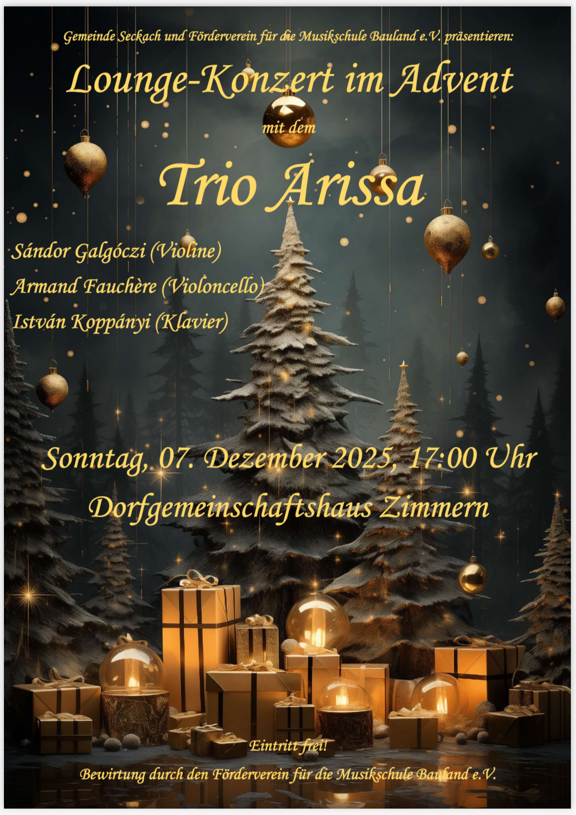Am Sonntag, 7. Dezember veranstaltet die Gemeinde Seckach zusammen mit dem Förderverein für die Musikschule Bauland e.V. um 17:00 ein besonderes Konzert im Dorfgemeinschaftshaus Zimmern: Ein Lounge-Konzert mit dem Trio Arissa! Neben Glühwein und Plätzchen sind zur optischen Auflockerung kleine Beistelltische zu den Sitzplätzen im Saal gruppiert, an denen man in gemütlicher Atmosphäre der Musik